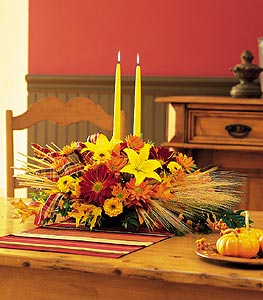 With two taper candles, fresh flowers and wheat, this lovely fall centerpiece is sure to light up any table setting, especially Thanksgiving.