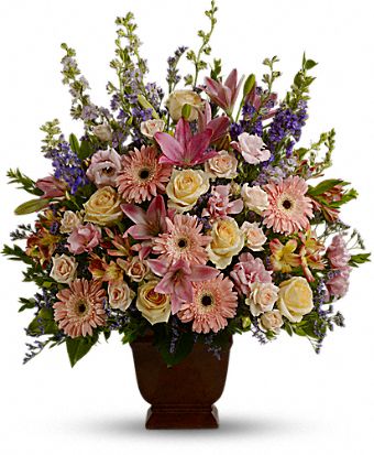 Honor a beautiful person with a beautiful bouquet. This lush, luxurious arrangement of assorted funeral flowers communicates your sympathy in soothing shades of soft pink, peach and lavender.